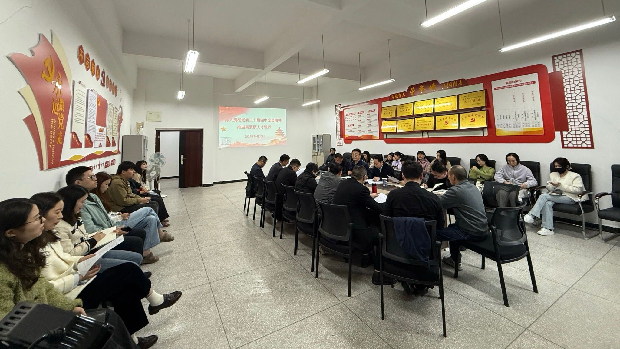 为深入学习贯彻党的二十届四中全会精神,进一步提升教职工政治理论素养和育人能力,10月30日下午,公共管理学院教工党支部在博学楼3栋520室开展“深入贯彻党的二十届四中全会精神 推进高素质人才培养”主题党日。会议由学院党总支书记赵翔宇教授主持,数学与统计学院专职组织员佟星列席旁听,学院全体教师党员参会。