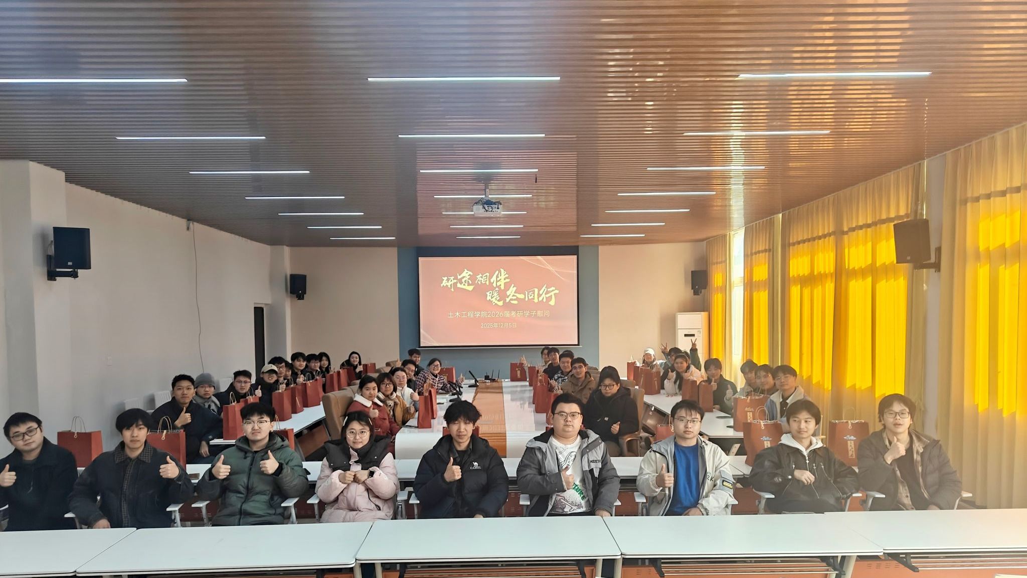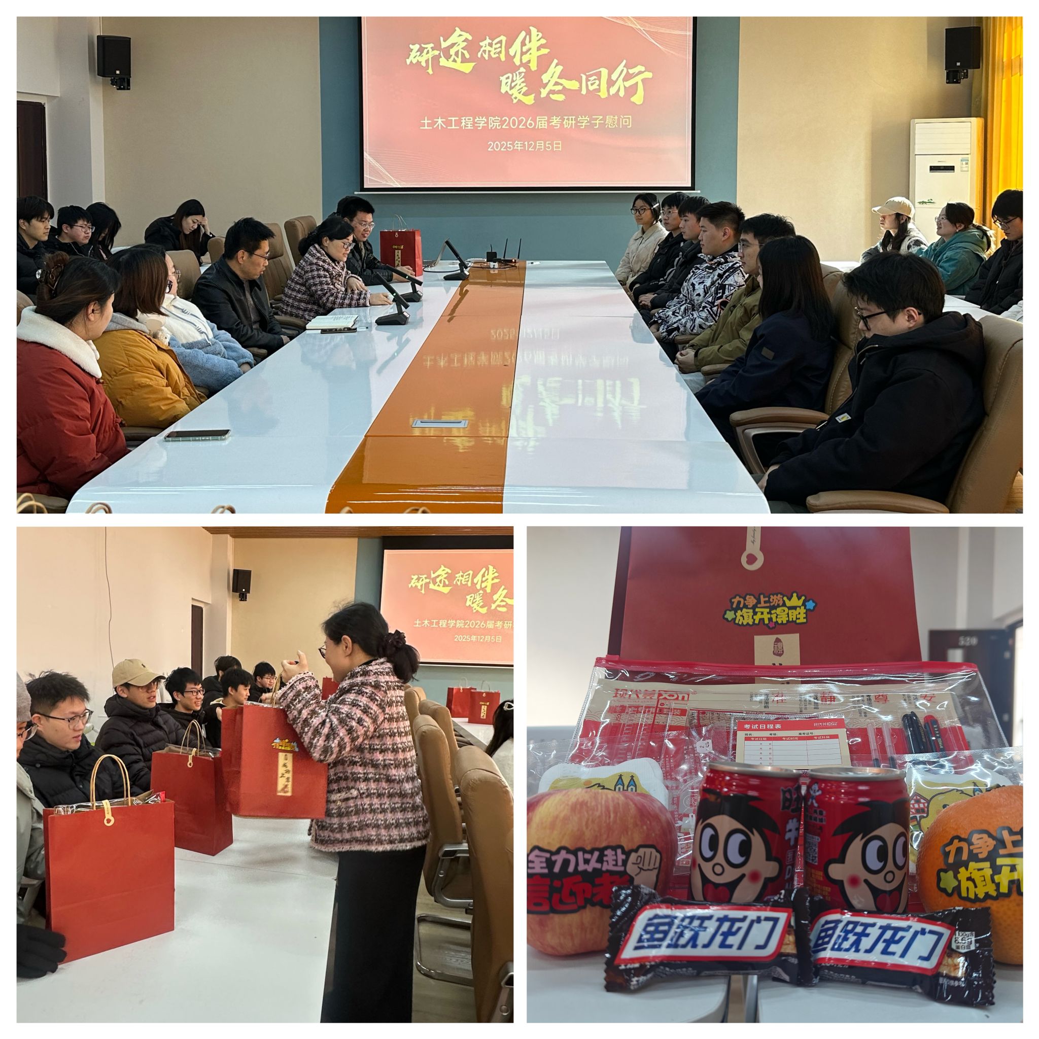 随着2026年全国硕士研究生招生考试进入关键的冲刺阶段,为缓解备考学子的压力,鼓舞士气,坚定信心,营造温暖向上的学习氛围,12月5日,土木工程学院党总支于慎思楼5-520精心组织开展了“研途相伴,暖冬同行”考研慰问活动,学院党总支书记罗雪、副院长刘芳平、辅导员杨楠和李浪组成慰问团,为正在紧张备考的2026届学子送去学院的深切关怀与暖心鼓励。