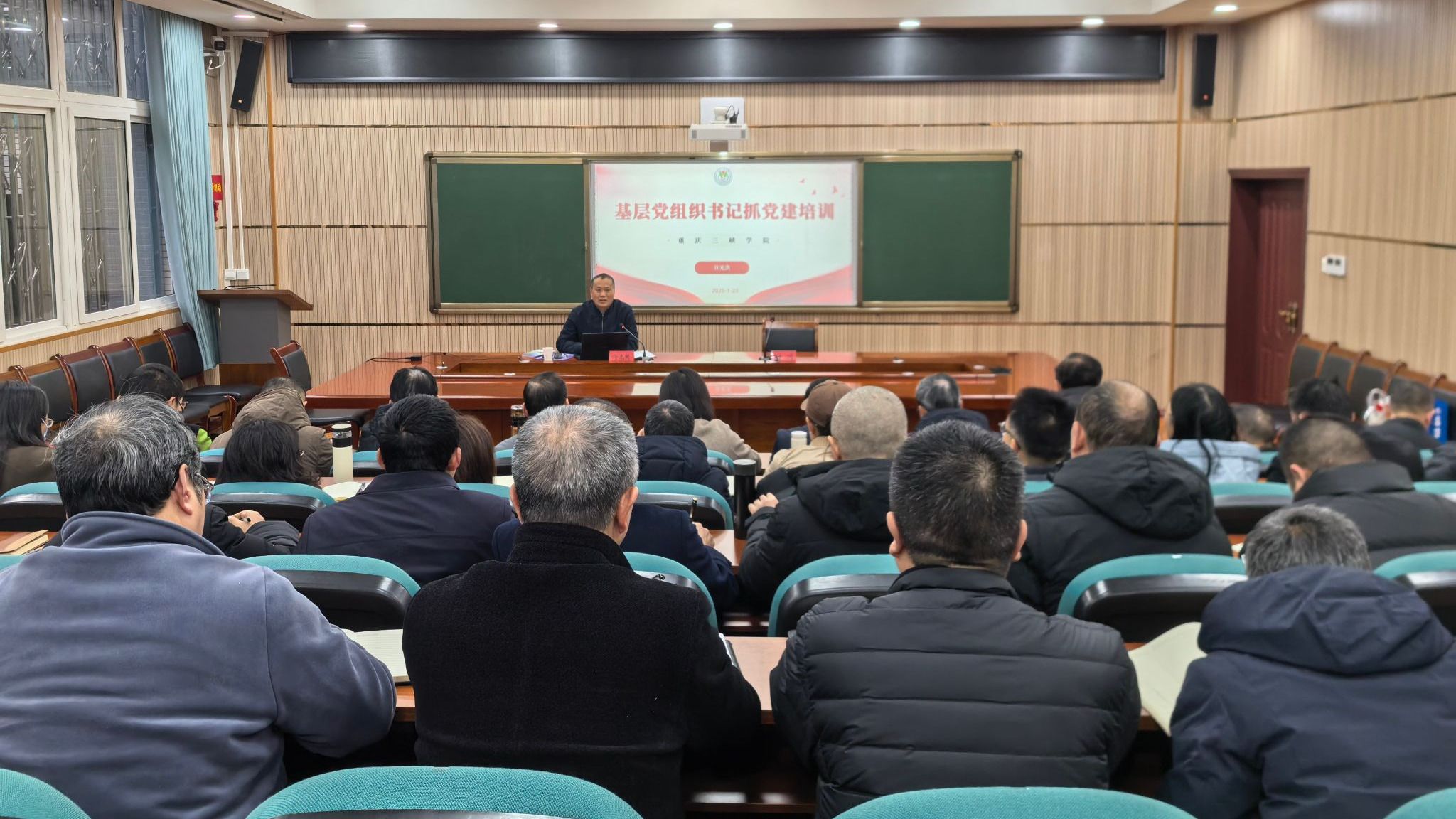 1月23日上午,学校党校“红岩先锋”学堂2026年第一课开讲。党委书记许光洪围绕“基层党组织书记抓党建”主题,为全校二级党组织书记等“关键少数”讲授“十五五”开局之年第一课。他强调,必须紧紧抓住二级党组织书记这一关键,坚持问题导向,深化落实党建统领“885”工作机制,活用学校“873”工作体系,切实将党建优势转化为推动学校高质量发展的制胜优势。
